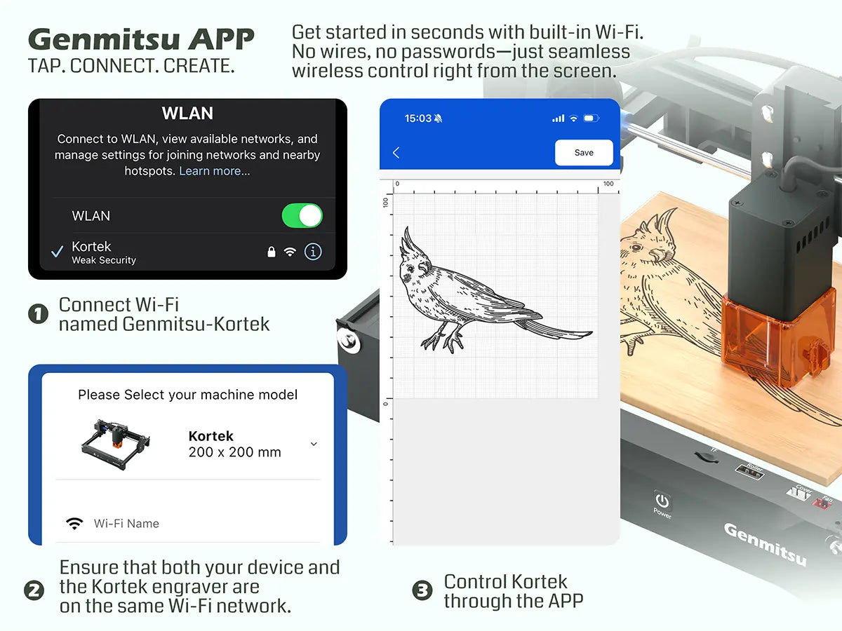 Kortek Laser Engraver Machine, 2.5W/5W/10W, ±0.01mm High Precision, IR Laser Compatible, Portable CNC Laser Cutter